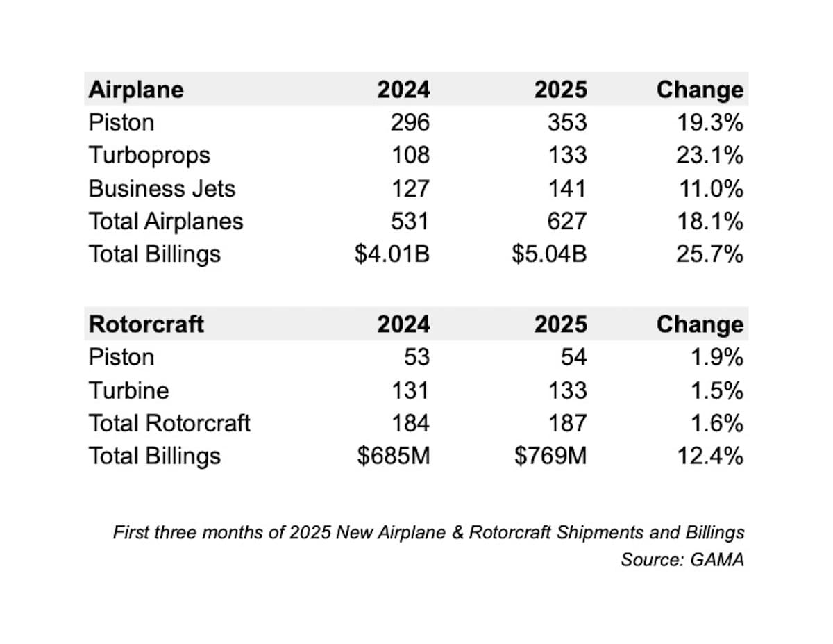 Airplane shipments through the first quarter of 2025, when compared to the same period in 2024, saw piston airplanes increase 19.3% with 353 deliveries, turboprops increase 23.1% with 133, and business jets increase 11% with 141.